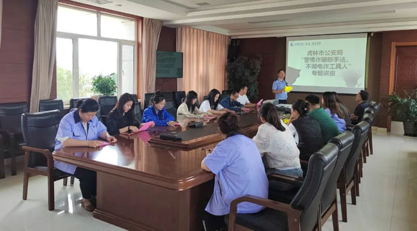 7月10日下午,虎林市公安局曙光派出所民警深入珍寶島藥業(yè)(虎林),開展電信網(wǎng)絡(luò)反詐騙宣講活動,公司人事行政總監(jiān)蘭培寶組織各部門員工第一時(shí)間到場聆聽宣講。